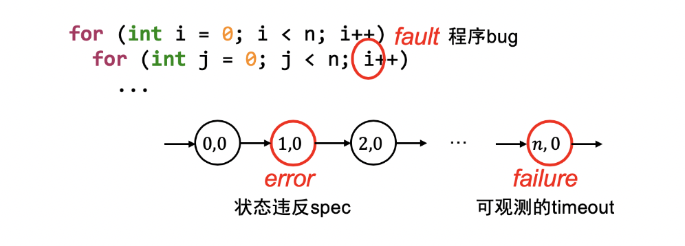 程序、输入、配置都可能出错,而这些都是 Bug,会导致状态机进入 Error 状态,最终在某个时刻报出 Failure。